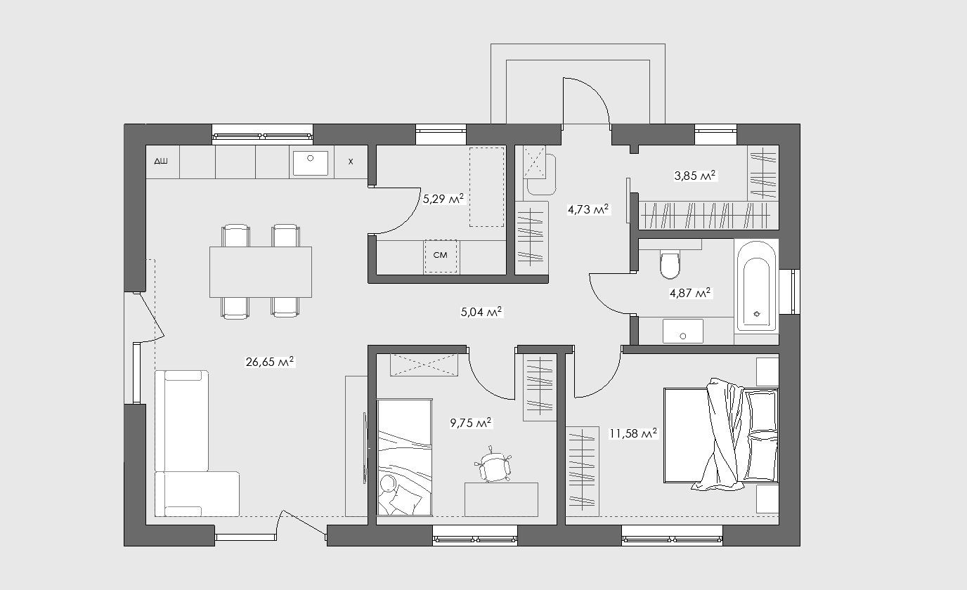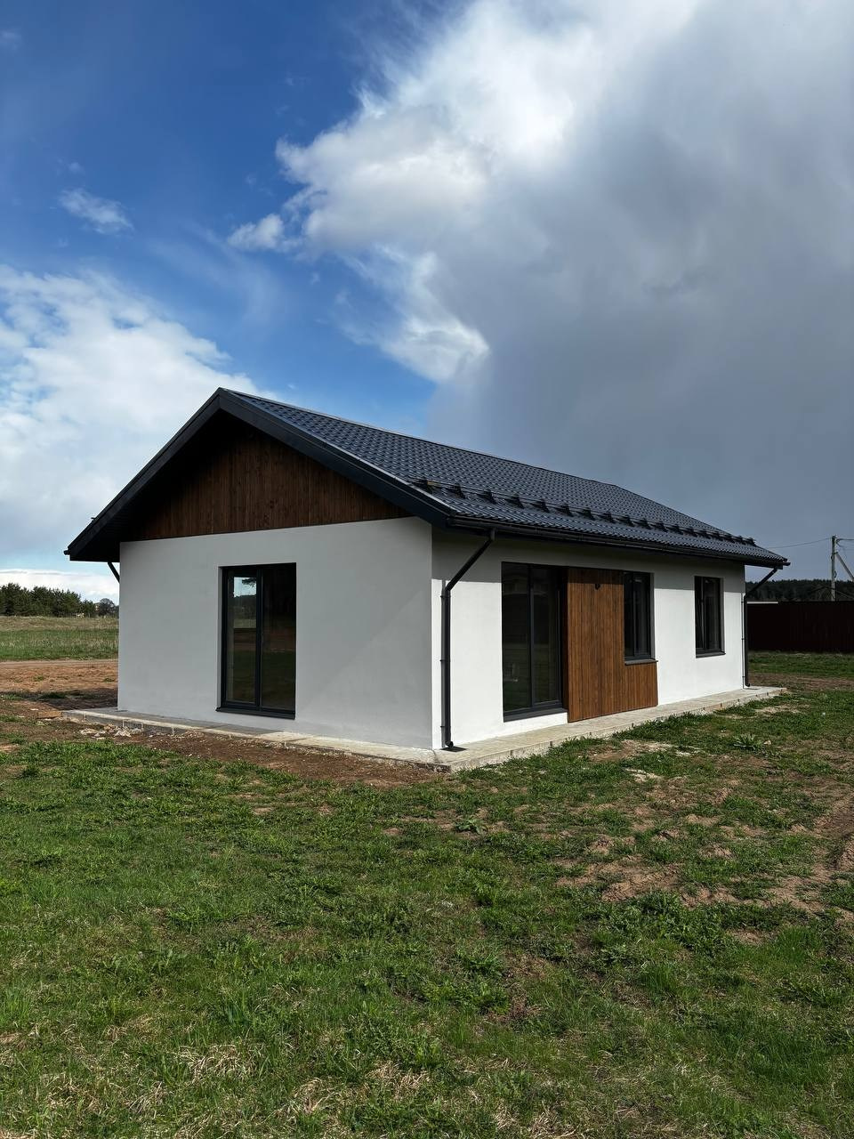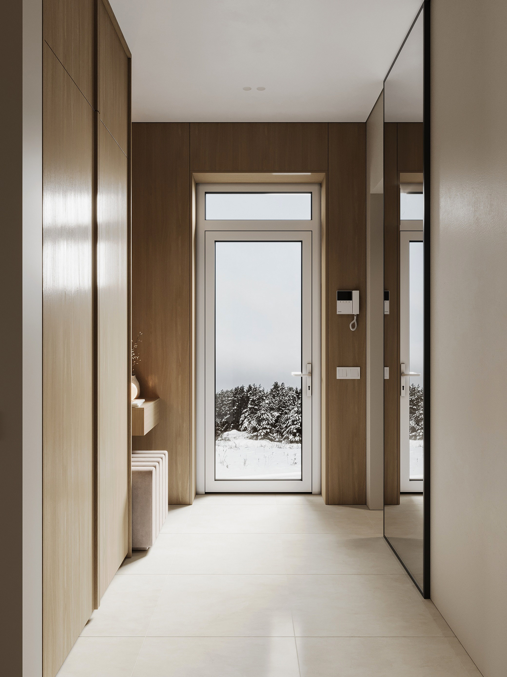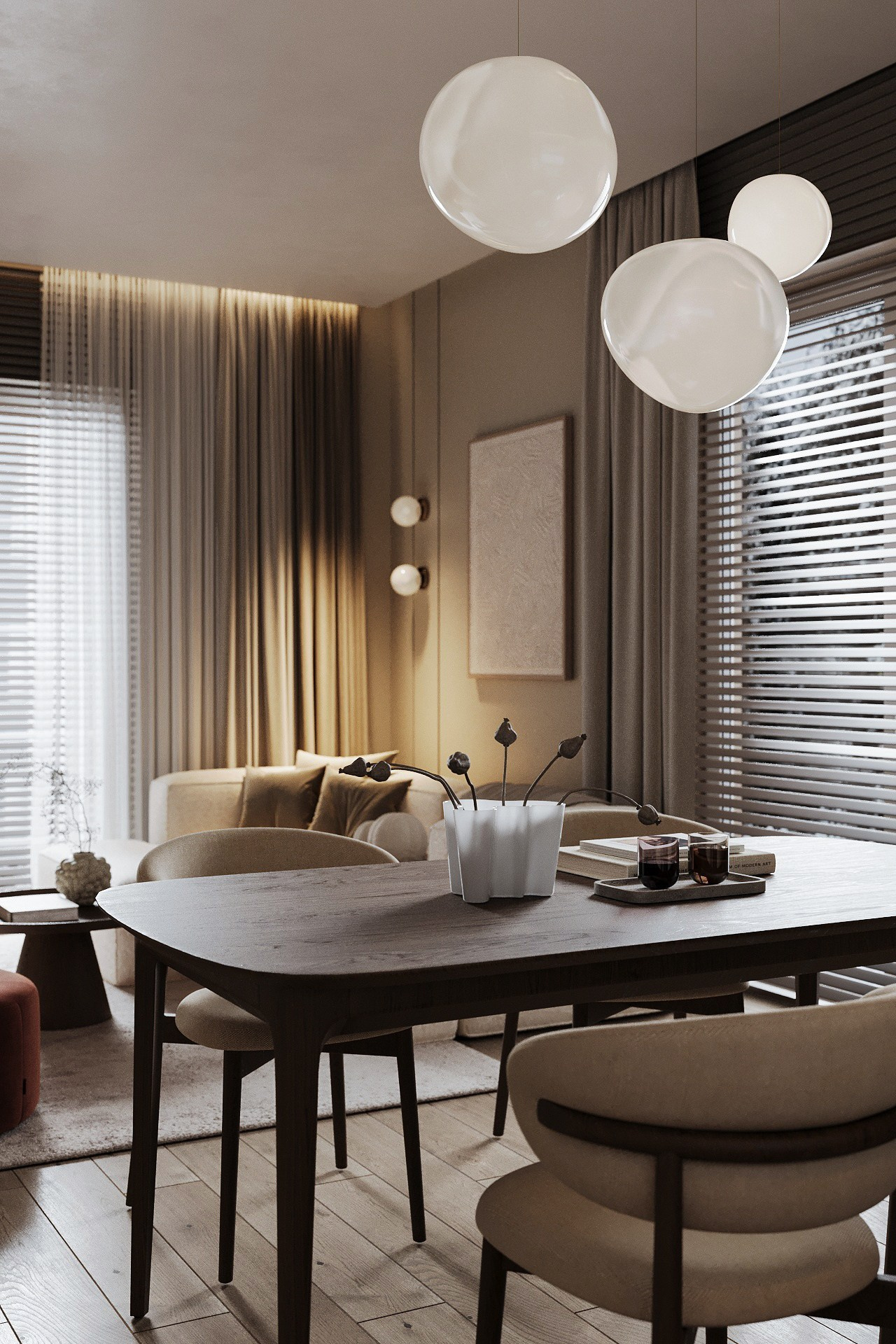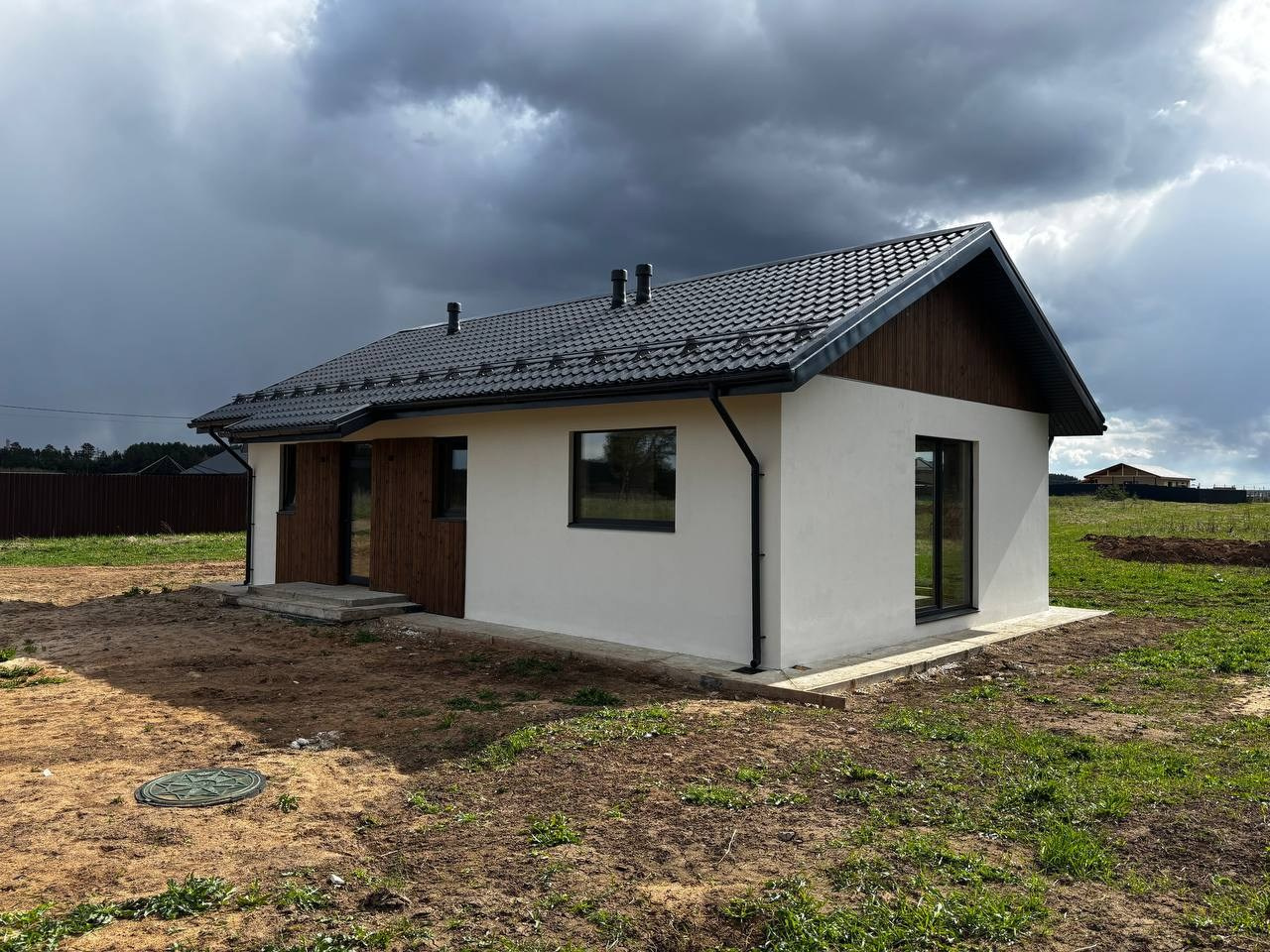 Дом по мотивам микеа, с панорамными окнами и выходом на террасу. Площадь кухни-гостиной 26 кв. м. здесь комфортно разместилась прямая кухня с мойкой у окна и большой стол с акцентыми подвесами. Со стороны кухни расположен вход в котельную.