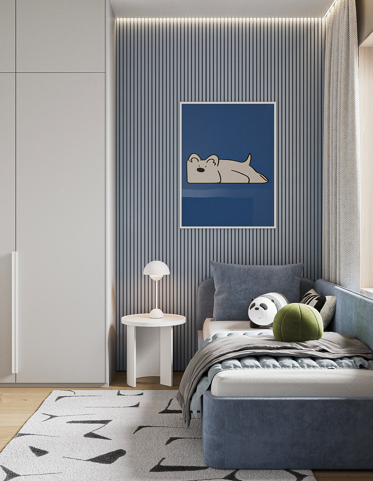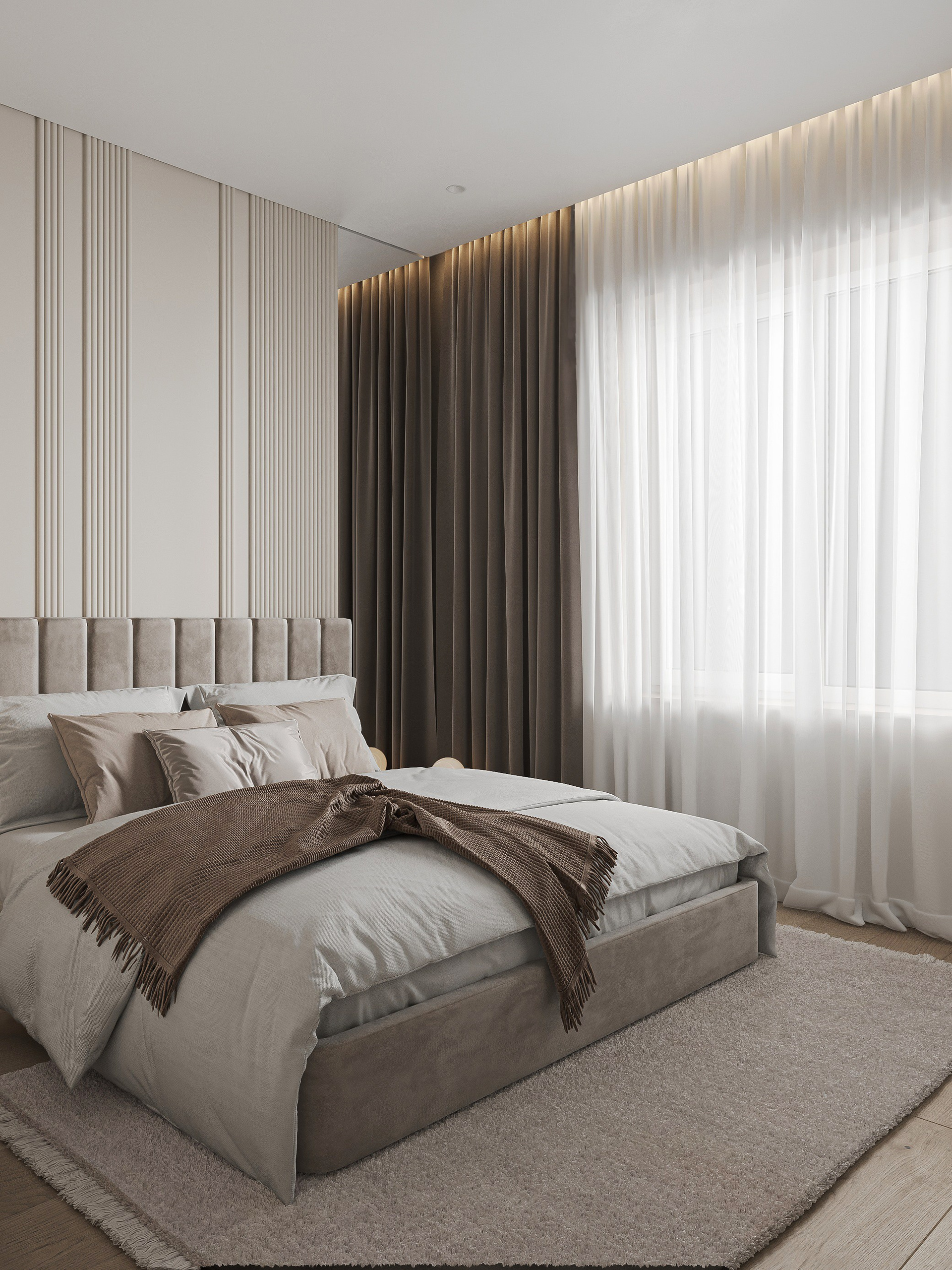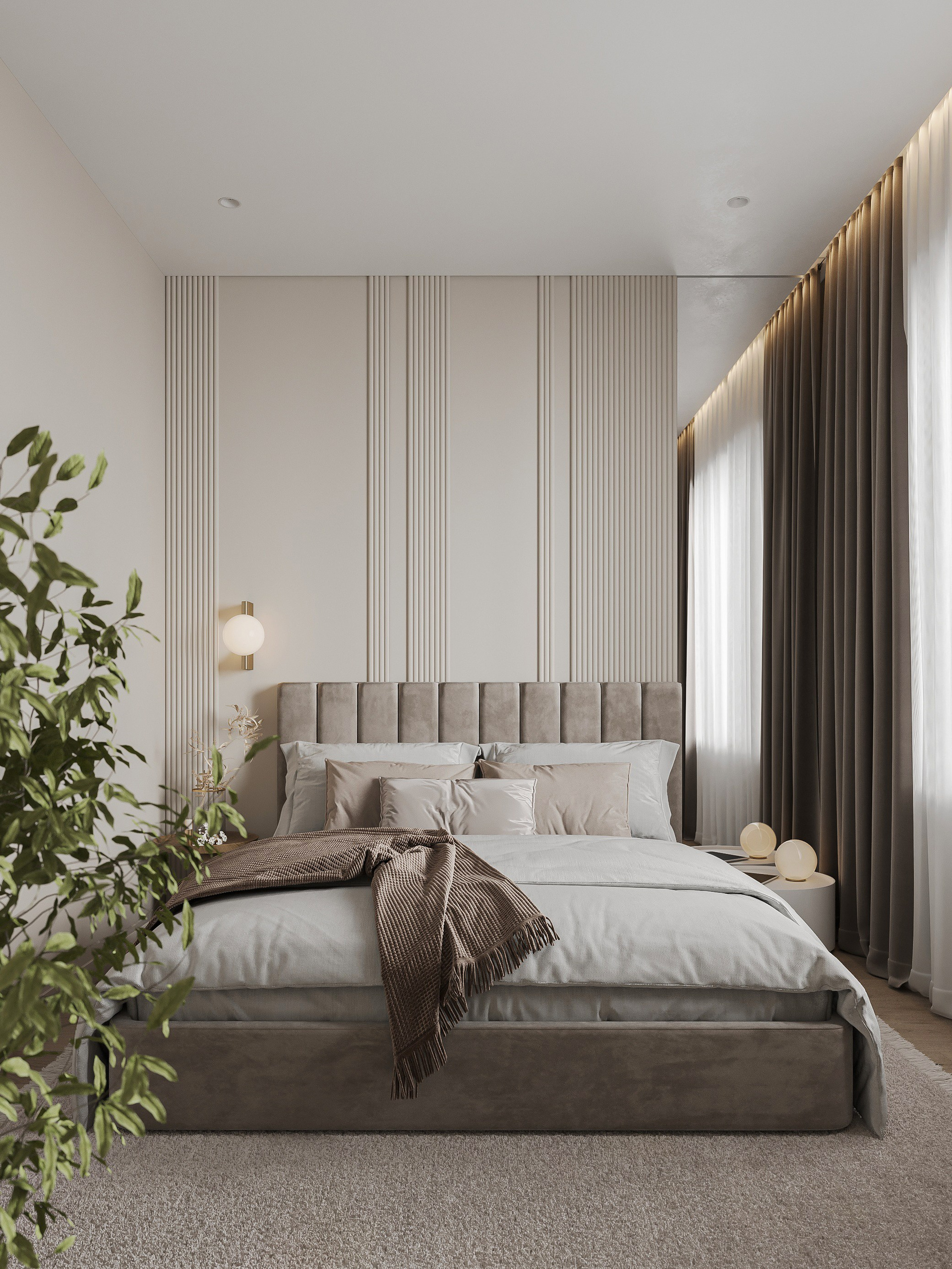Уютное небольшое пространство с теплыми оттенками стен и вертикальными элементами в виде гипсовых панелей вдоль изголовья.