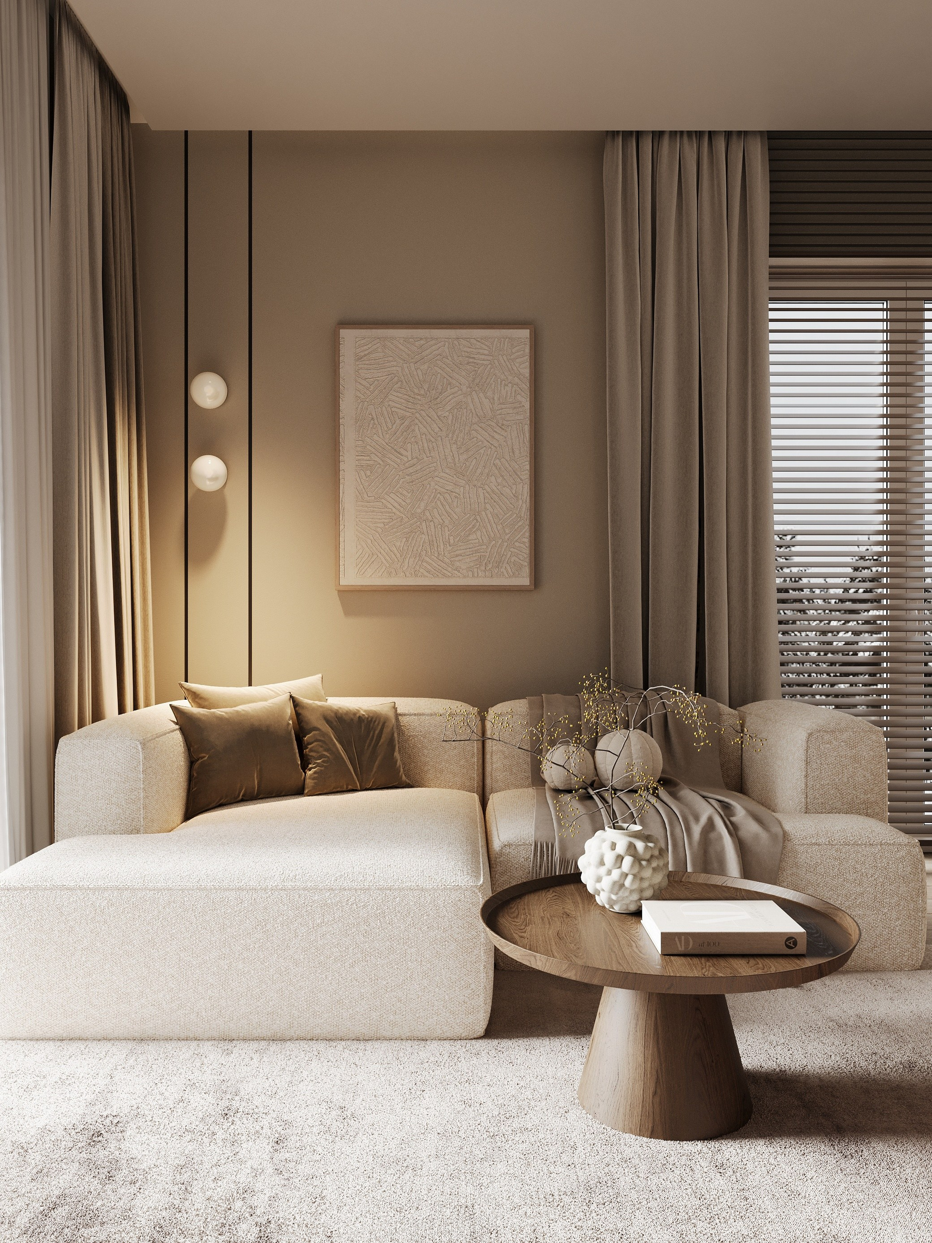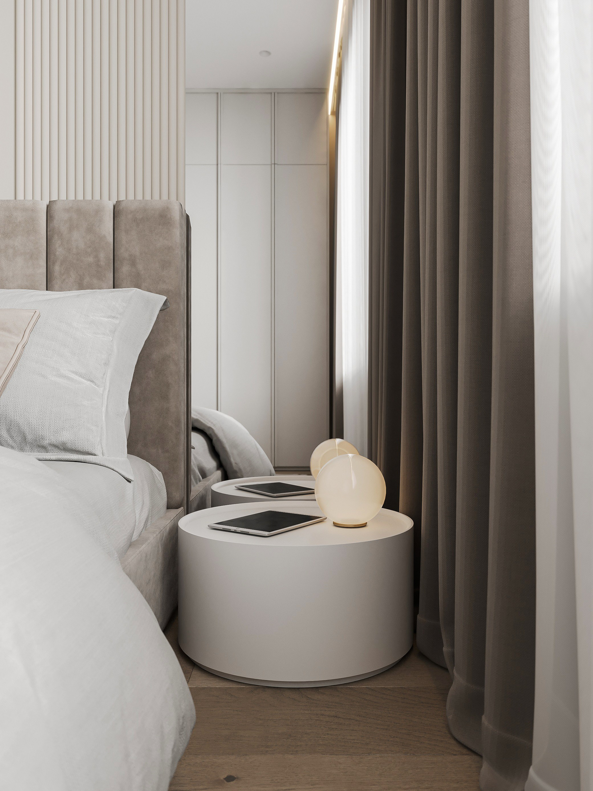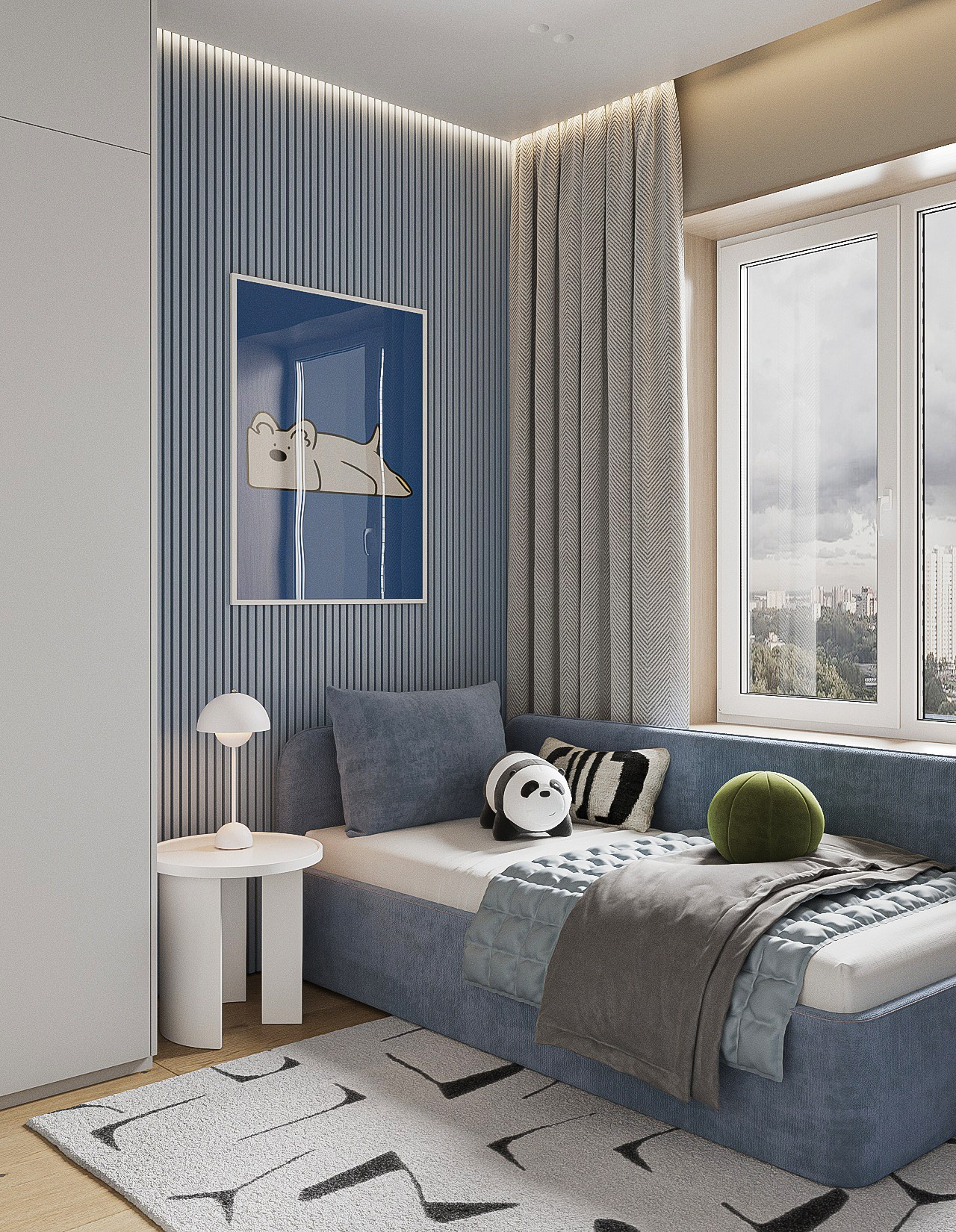 Уютное небольшое пространство с теплыми оттенками стен и вертикальными элементами в виде гипсовых панелей вдоль изголовья.