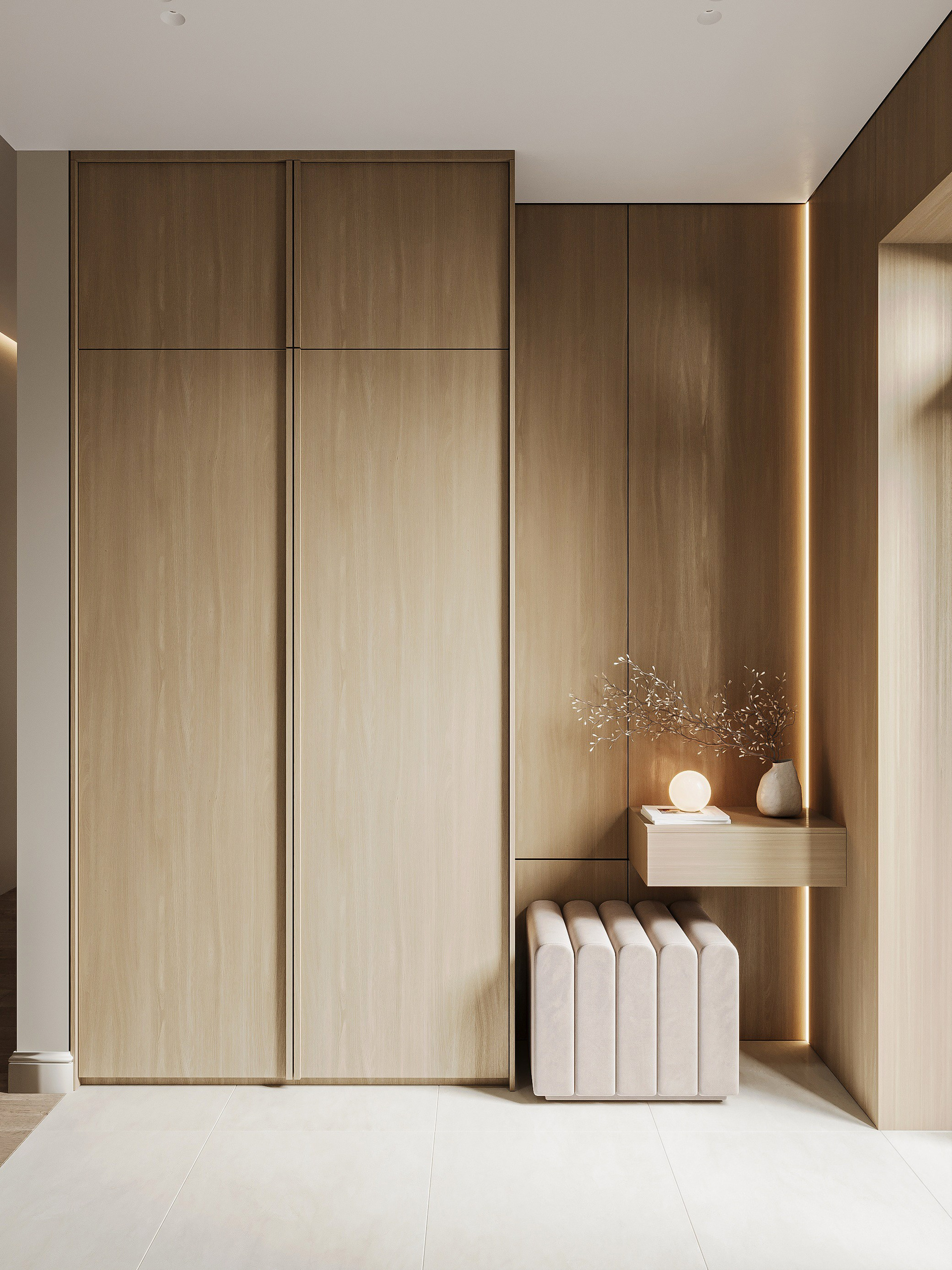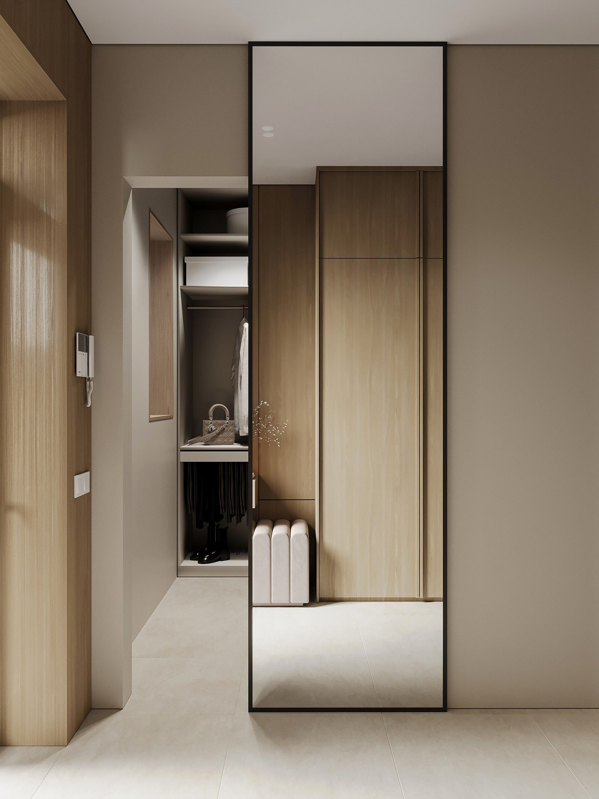 Прихожая компактная, здесь удалось разместить шкаф для одежды, полочку для ключей и мелочи, пуф. Сразу при входе располагается гардероб, вход в него через раздвижную зеркальную дверь. Здесь же дверь в ванную комнату и спальню.