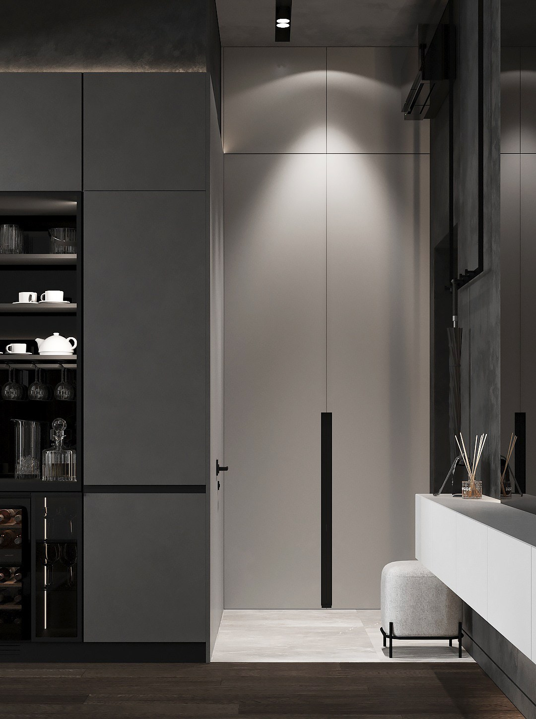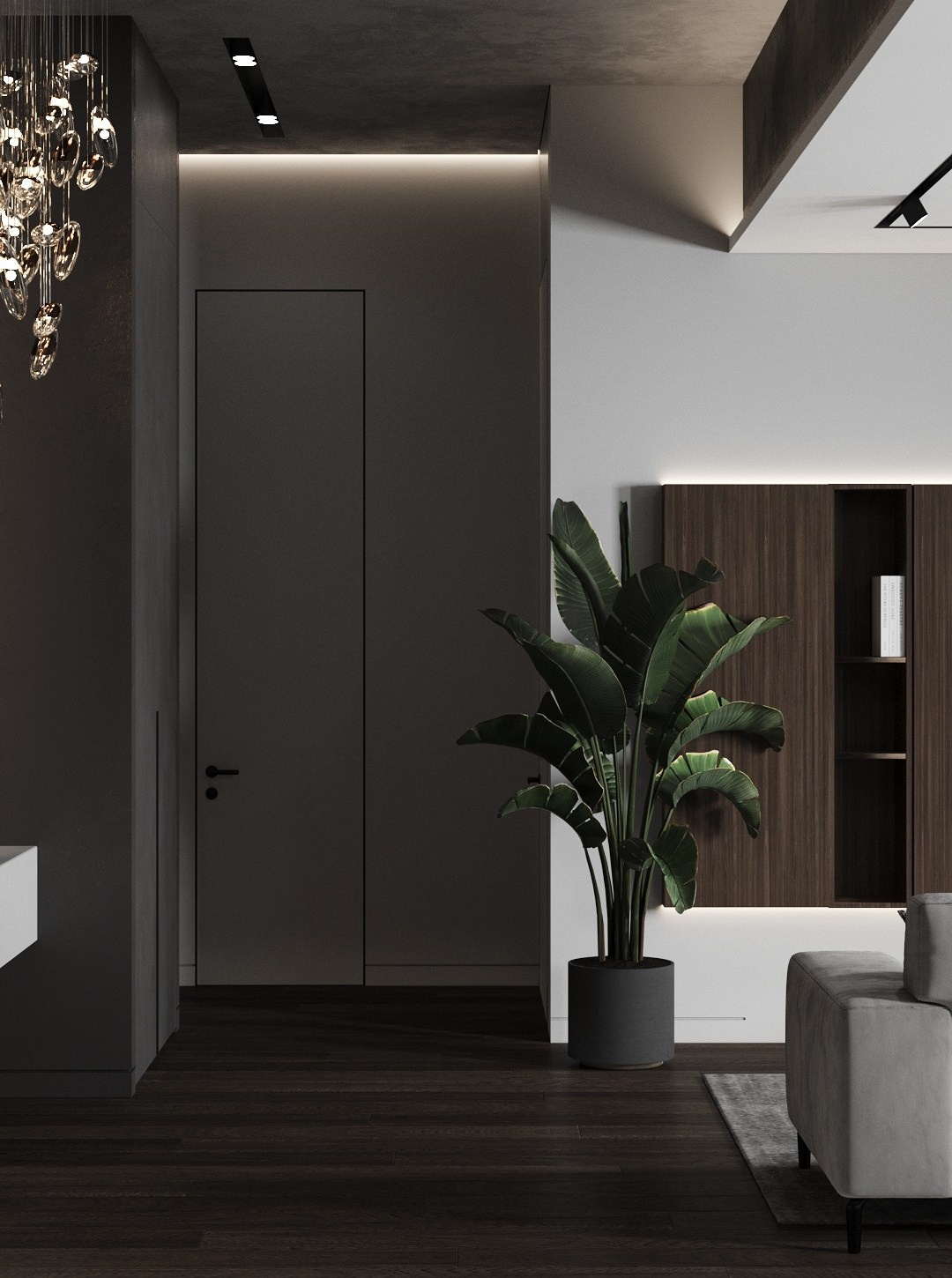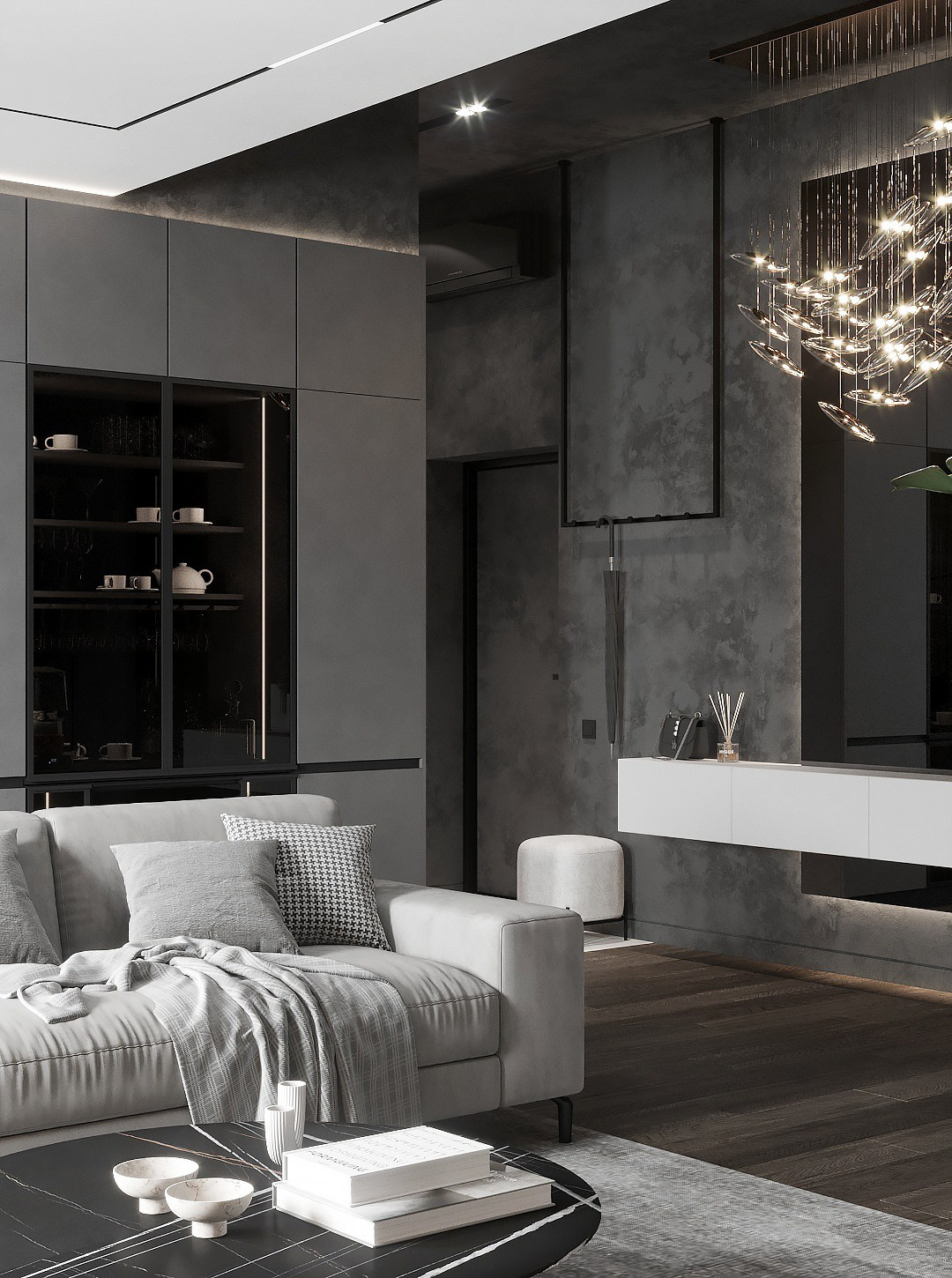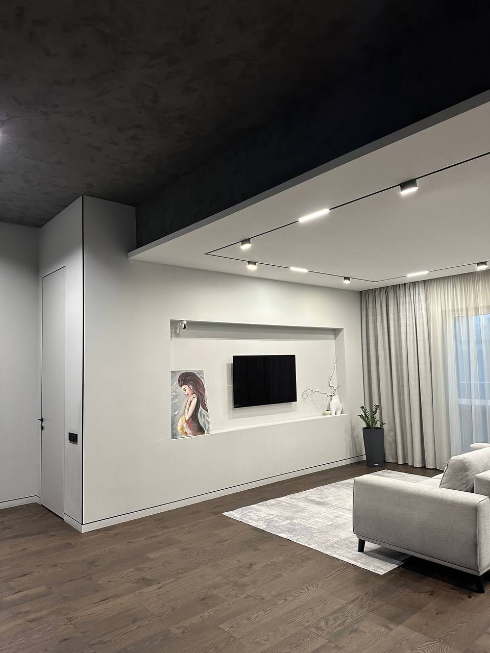 В начале работы над проектом было предложено несколько вариантов, исходя из конфигурации квартиры, расположение окон и инженерных точек. Потолок в прихожей и гостиной нам удалось отлично связать с помощью разных видов отделки — в зоне прихожей мы применили темную штукатурку, а в зоне гостиной обычный белый гкл-потолок с небольшим специальным выступом для эффекта легкости конструкции