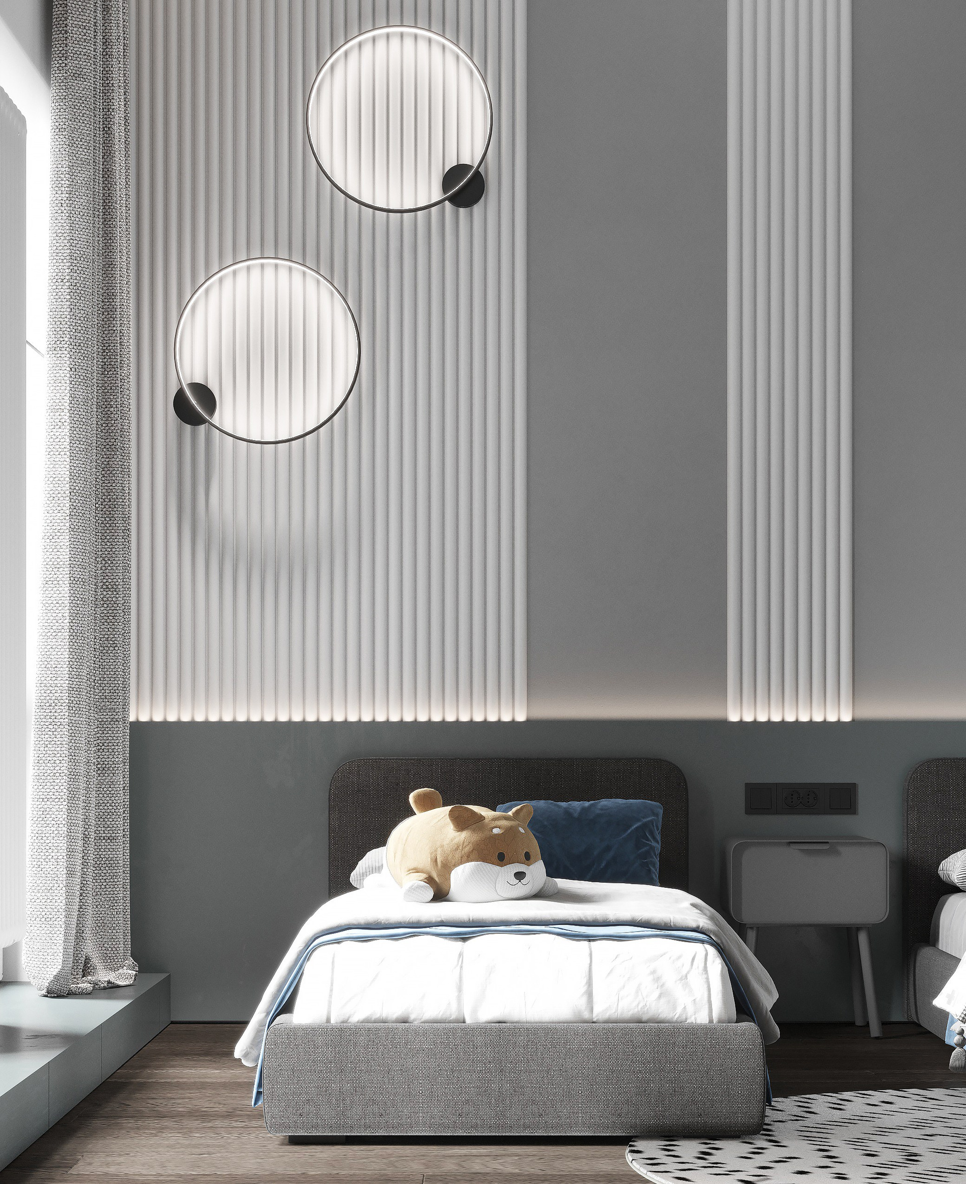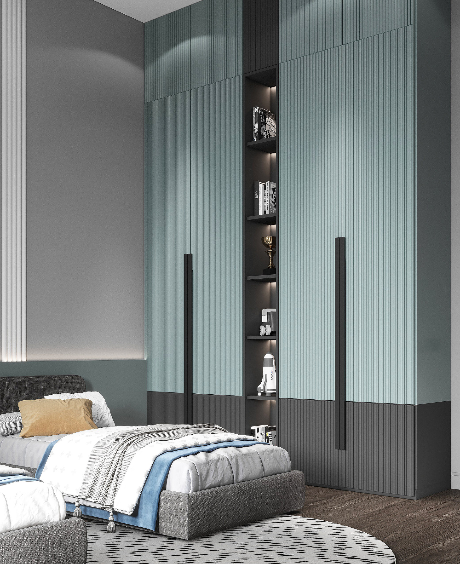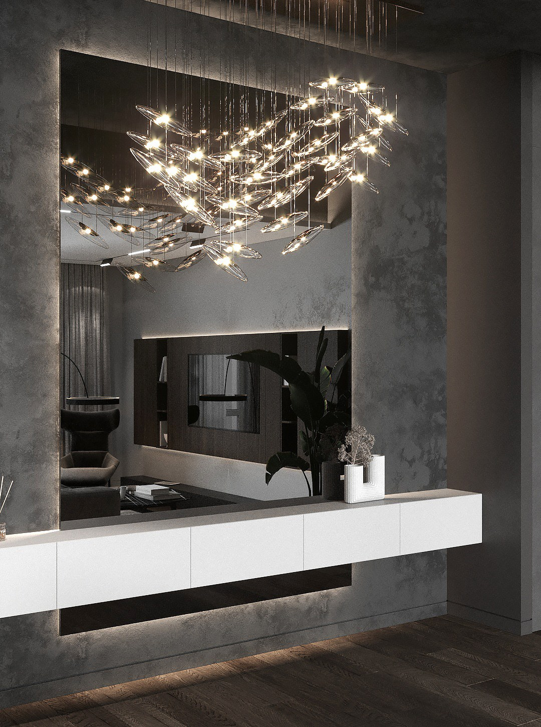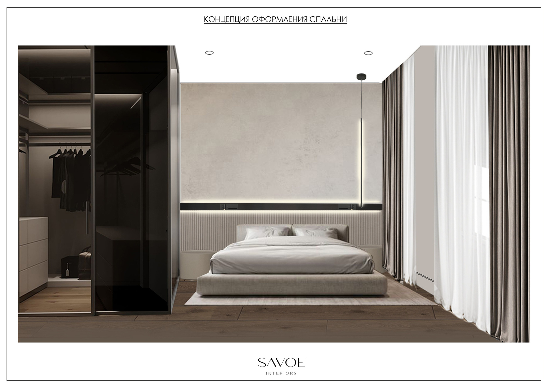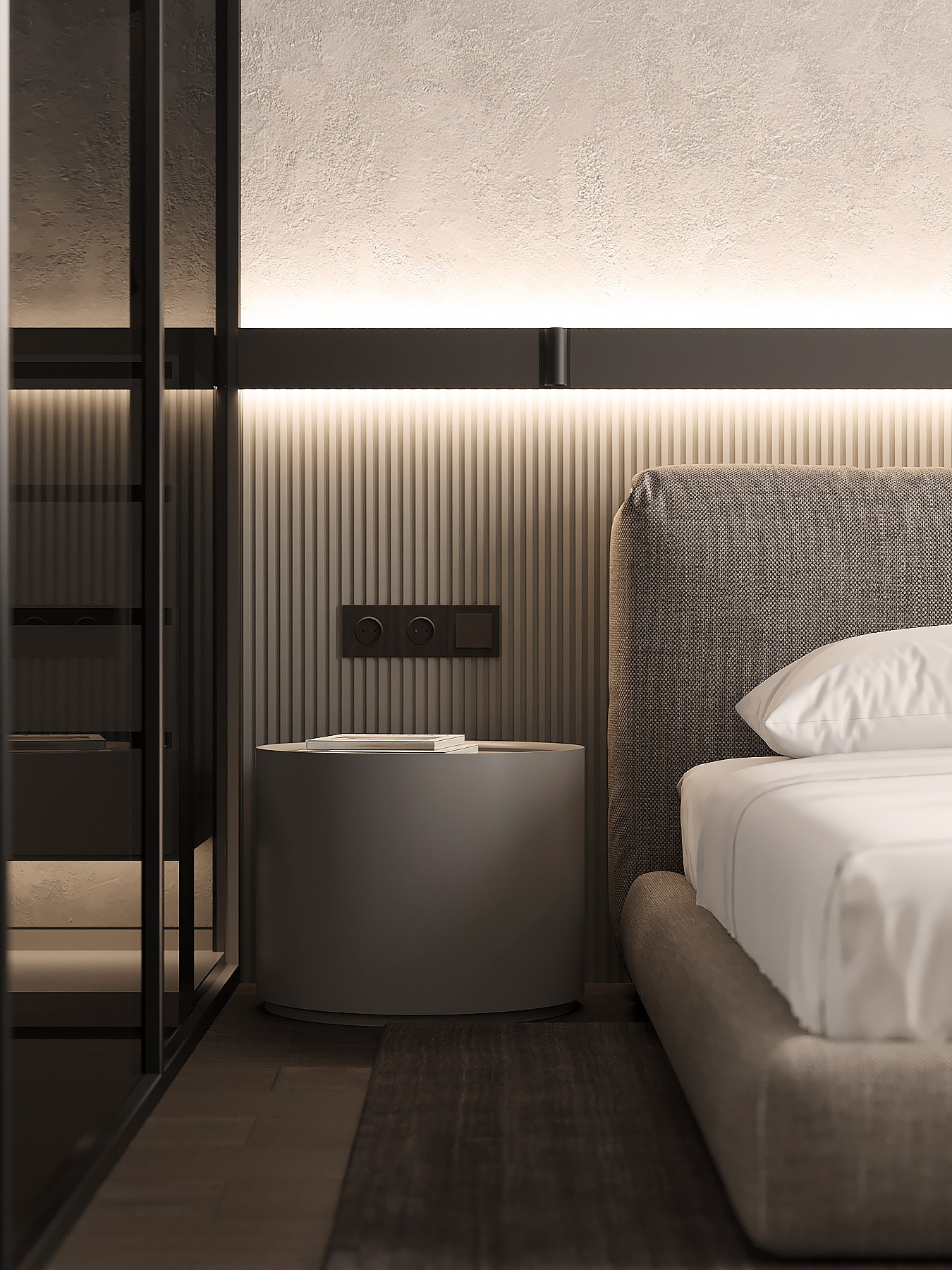 В начале работы над проектом было предложено несколько вариантов, исходя из конфигурации квартиры, расположение окон и инженерных точек. Потолок в прихожей и гостиной нам удалось отлично связать с помощью разных видов отделки — в зоне прихожей мы применили темную штукатурку, а в зоне гостиной обычный белый гкл-потолок с небольшим специальным выступом для эффекта легкости конструкции