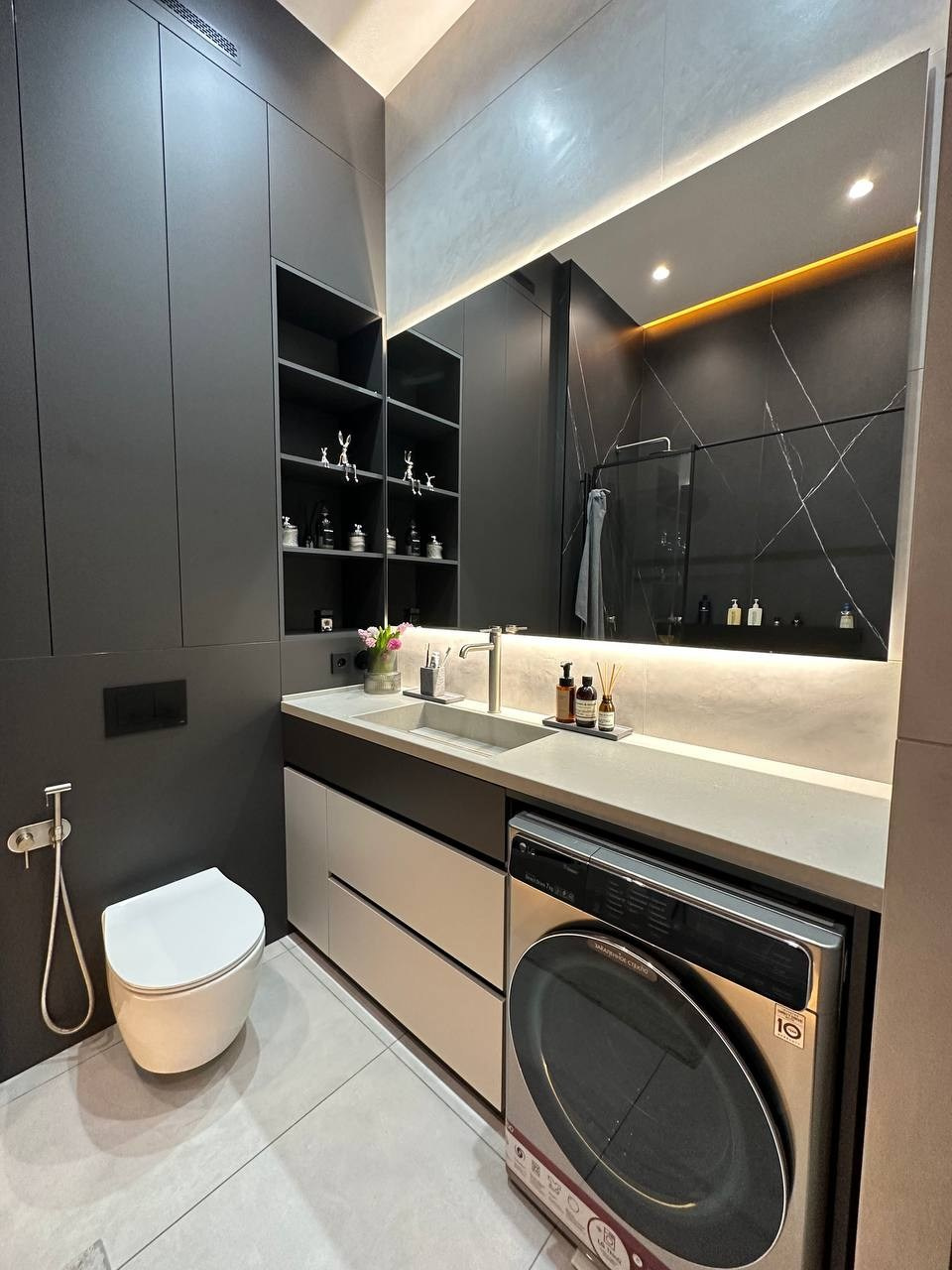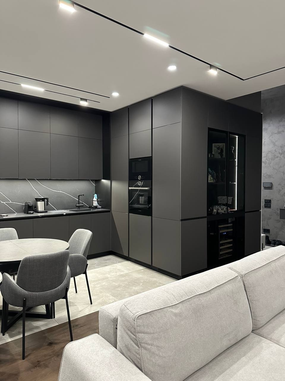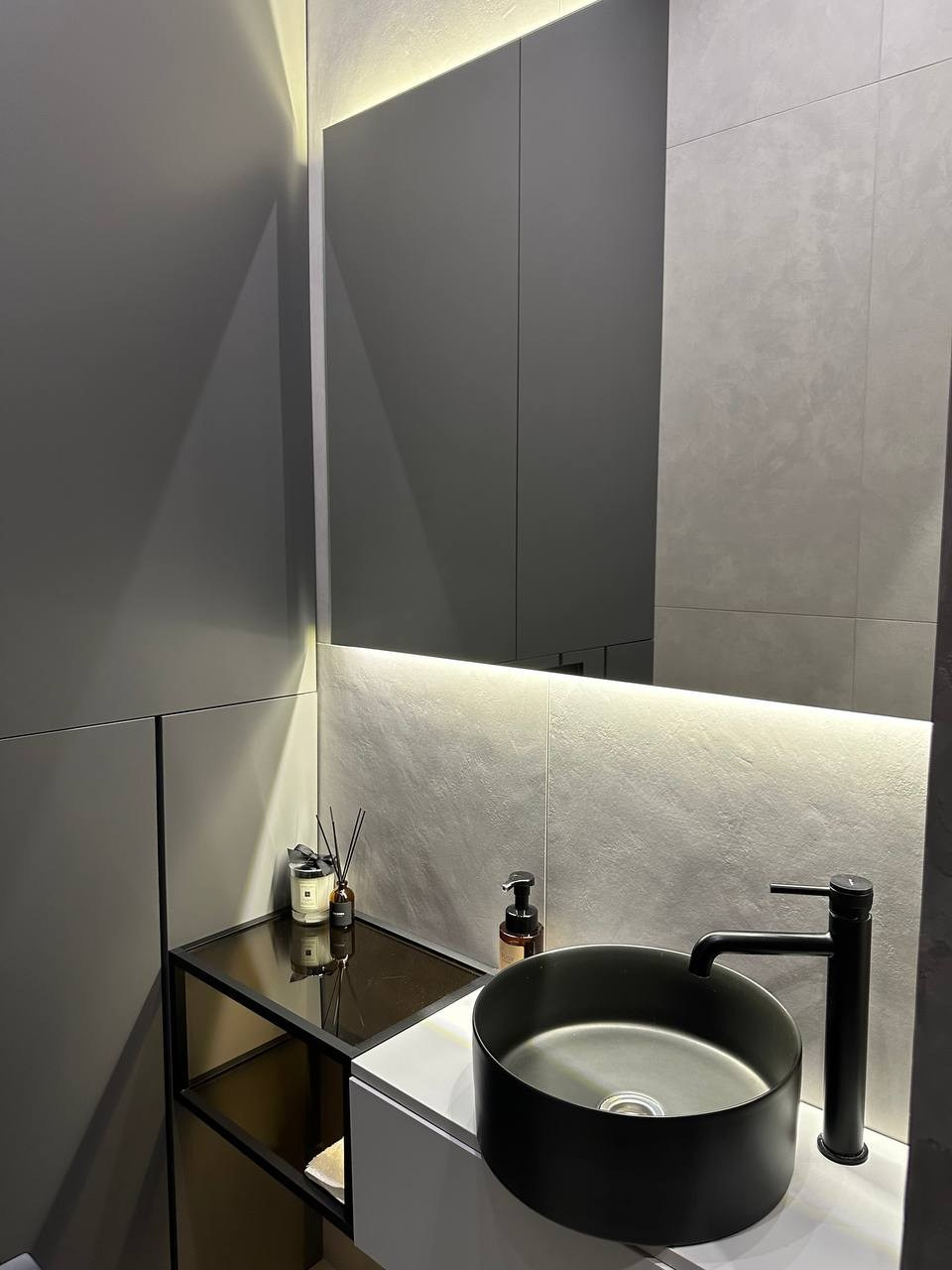 Применяемые материалы в данном проекте — кгл -потолки с трековым освещением, отделка стен покраска/декоративная штукатурка, на полу инженерная доска, в ванне применения крупформатного керамогранита 160×80 см, высокие двери на 2,8 м, гипсовые панели, плинтус скрытого монтажа. Данный проект не простой, стоимость реализации с такими решениями на 2023 г. — 150 тыс. за кв. м.