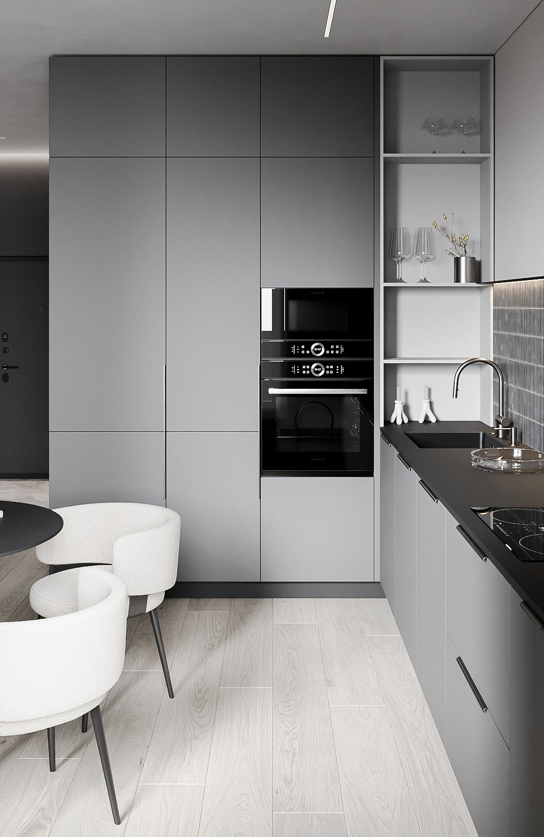 На данной площади квартиры нам удалось разместить отдельно спальню со световым окном, угловую функциональную кухню, зону гостиной с модульными секциями дивана.