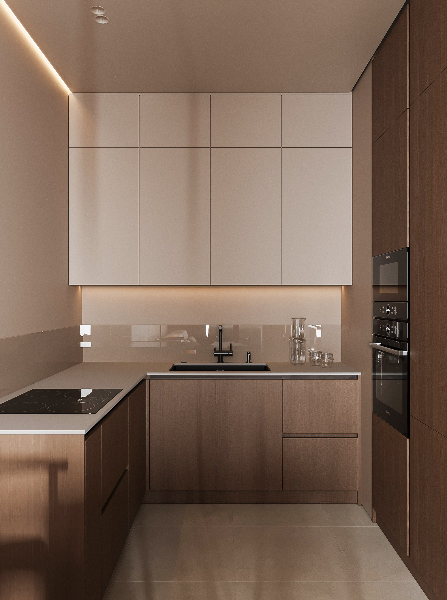 Угловая кухня: справа расположены пеналы под основную технику, слева нижние секции с шпонированными фасадами, верхние светлые секции под потолок, с фасадами мдф под эмаль. Фартук — стекло, пожелание было в целом не использовать керамогранит в данной зоне, но в плане практичности были сомнения, поэтому решено применить именно это решение, возможно в реализации рассмотрим и другие варианты.