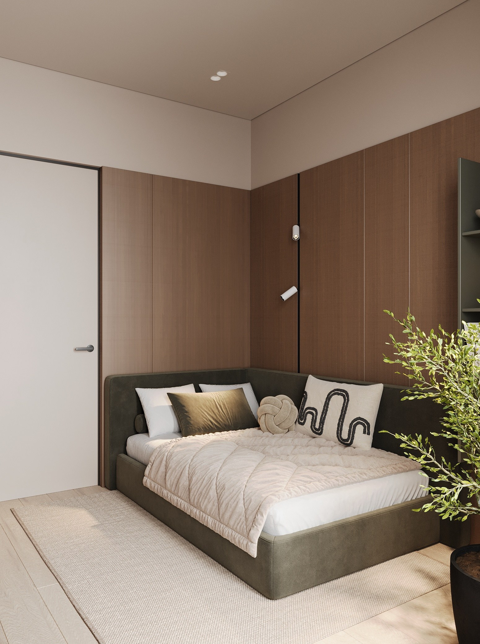 Уютное небольшое пространство с теплыми оттенками стен и элементами под дерево в качестве панели.